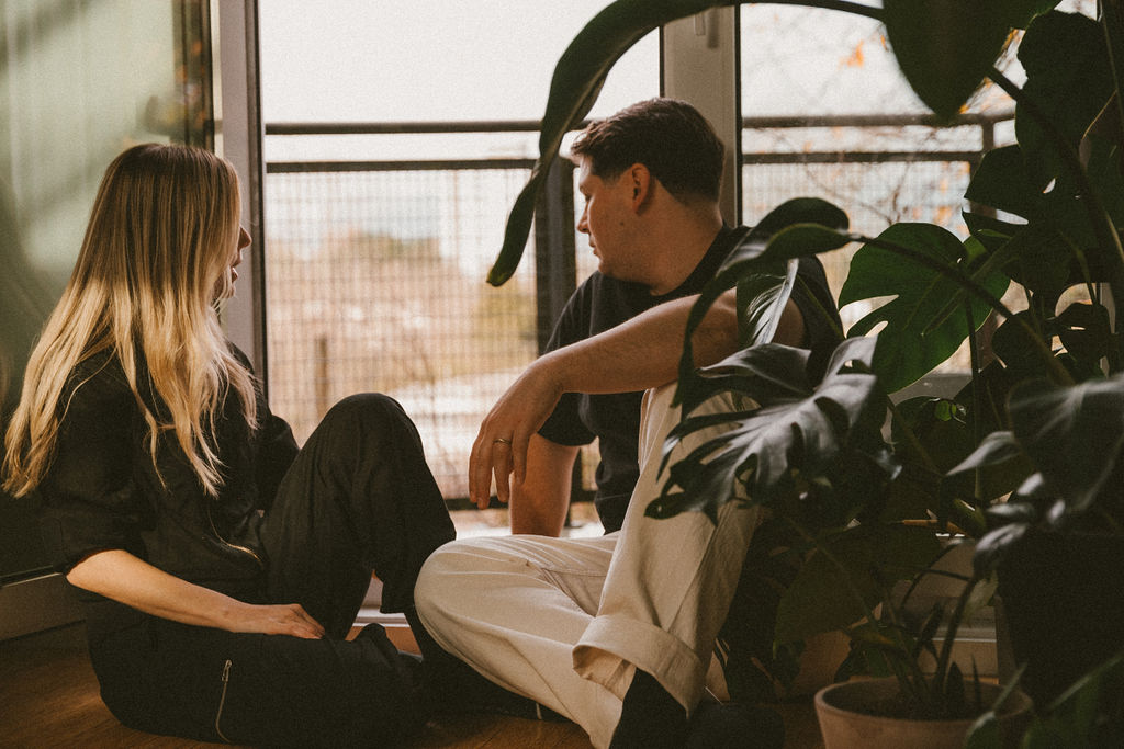 They spent the session doing a few of their favourite things: sharing coffee, drawing single-line portraits of eachother, reading side by side, and snuggling with their beloved cat.
